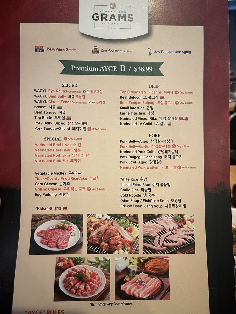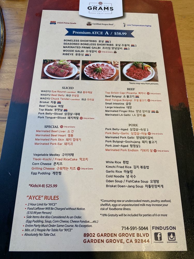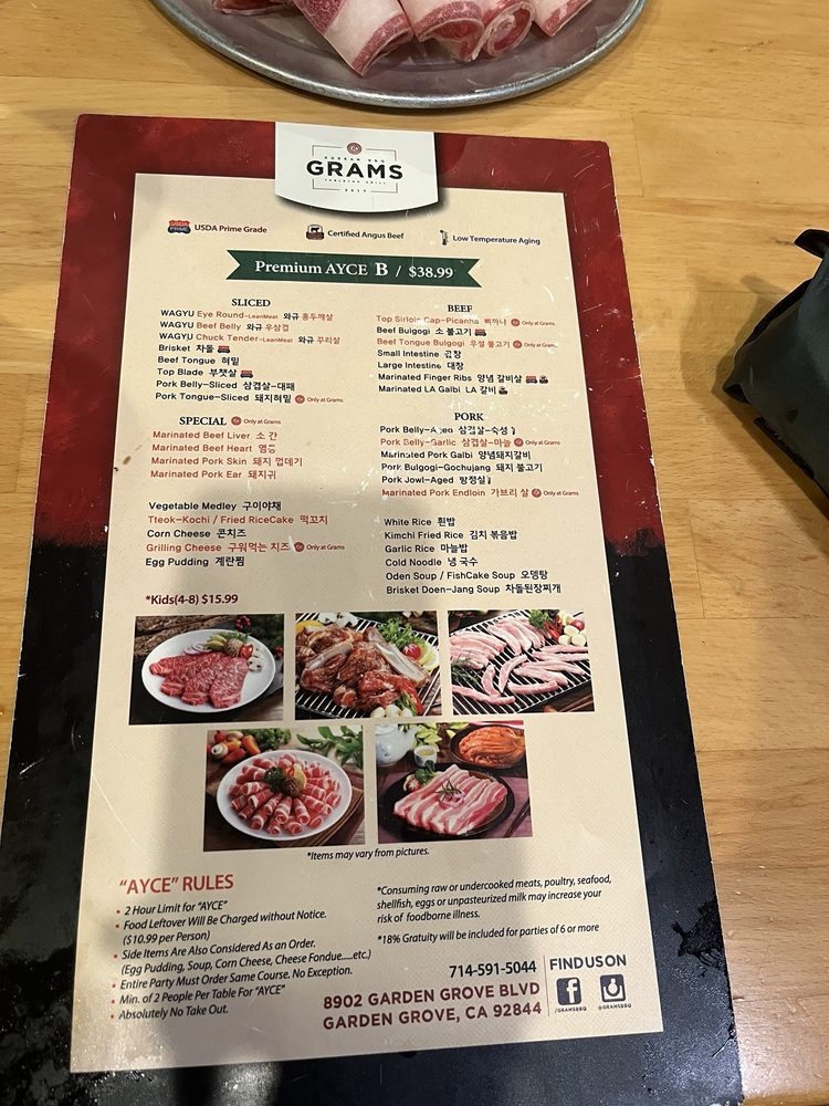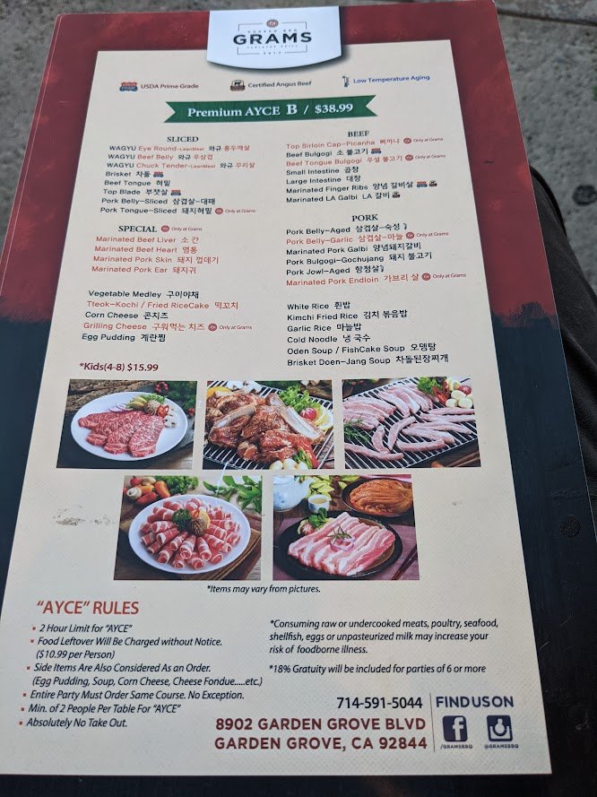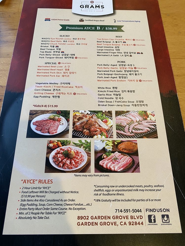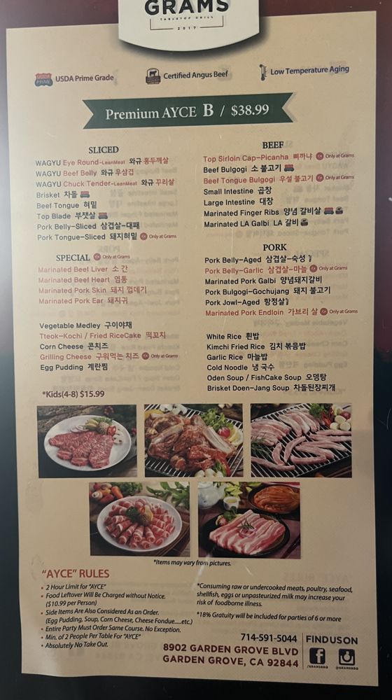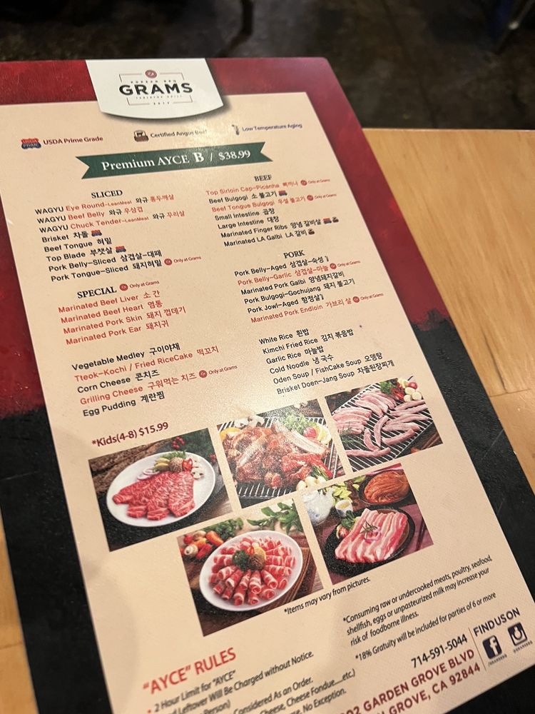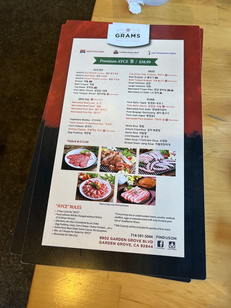 Introducing the menu at Grams BBQ, located in Garden Grove, CA, offers a delightful array of Korean BBQ options. The restaurant boasts a casual yet trendy ambiance, perfect for lunch, dinner, or late-night cravings. With options for delivery, takeout, and reservations, they also cater to vegans and accept various forms of payment, including cryptocurrency. The menu features premium cuts like Beef Tongue, Finger Ribs, and LA Galbi, complemented by must-try dishes such as Rice Paper, Banchan set, and Corn Cheese. Reviews rave about the top-quality meats, delicious sides, and attentive service. Be sure to try their premium AYCE option for an unforgettable dining experience. Overall, Grams BBQ stands out for its quality, ambiance, and exceptional value, making it a must-visit for Korean BBQ enthusiasts and foodies alike.